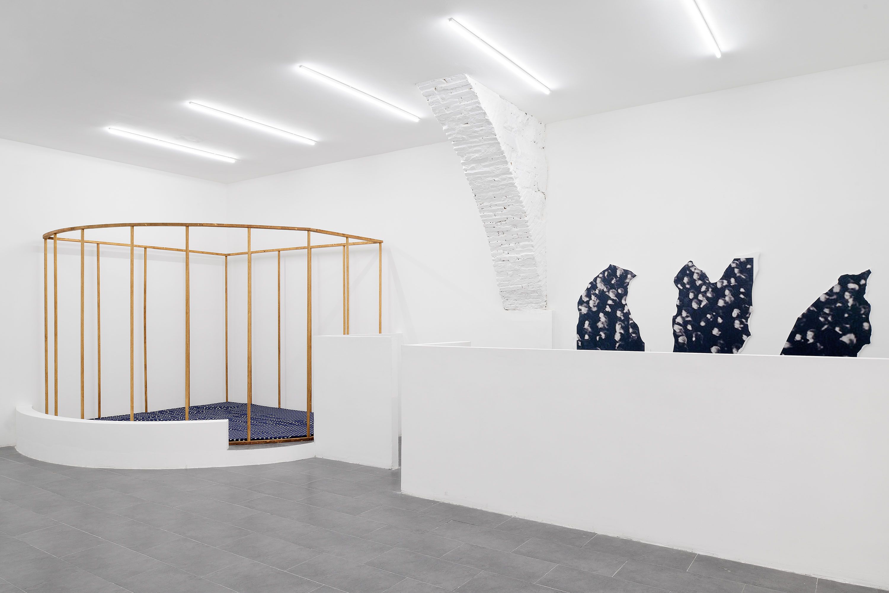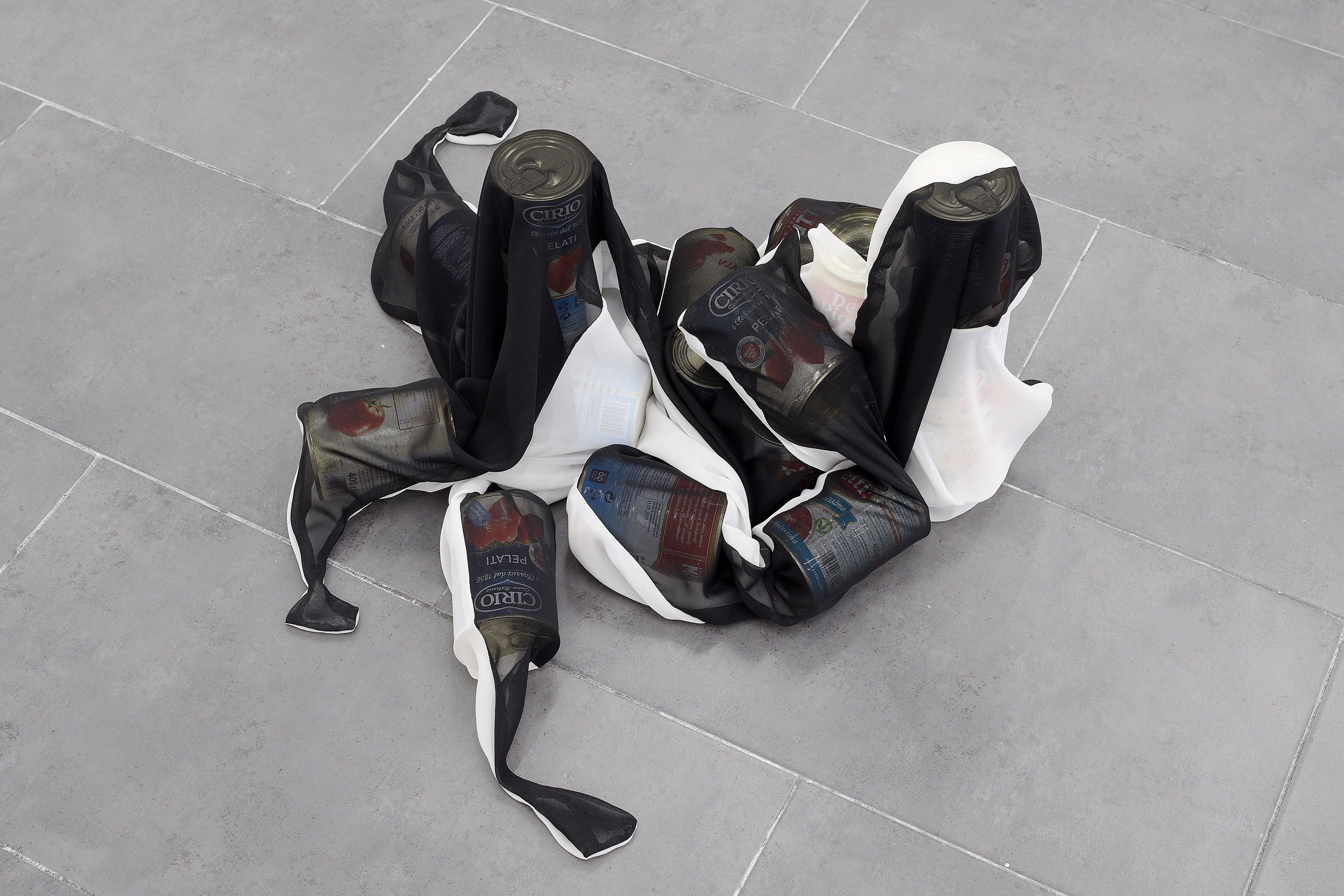 installation view, new words, Emanuel Layr, Rome The Nest Is Served, 2017 wood, cotton, styrofoam dimensions variable hunch, 2017 polyester, thread, cans dimensions variable