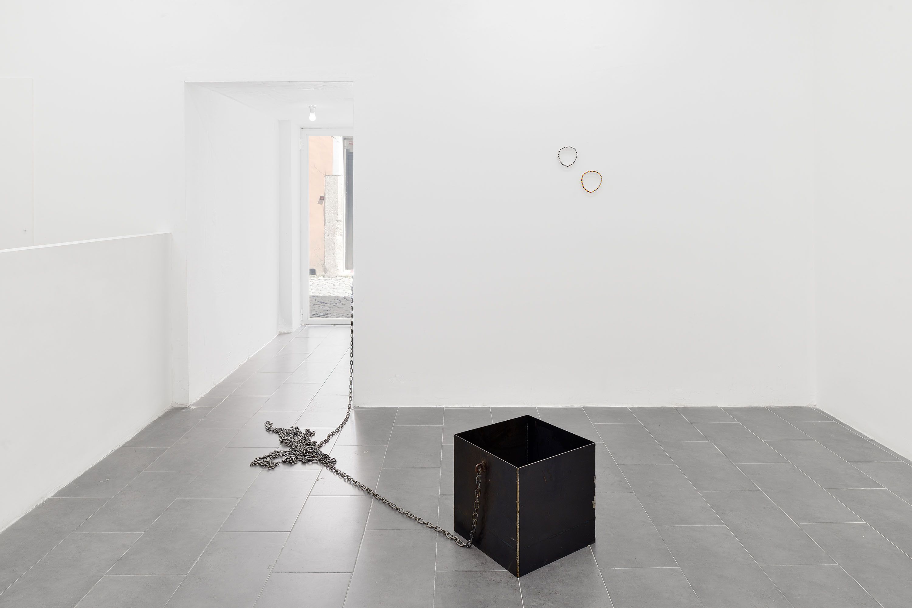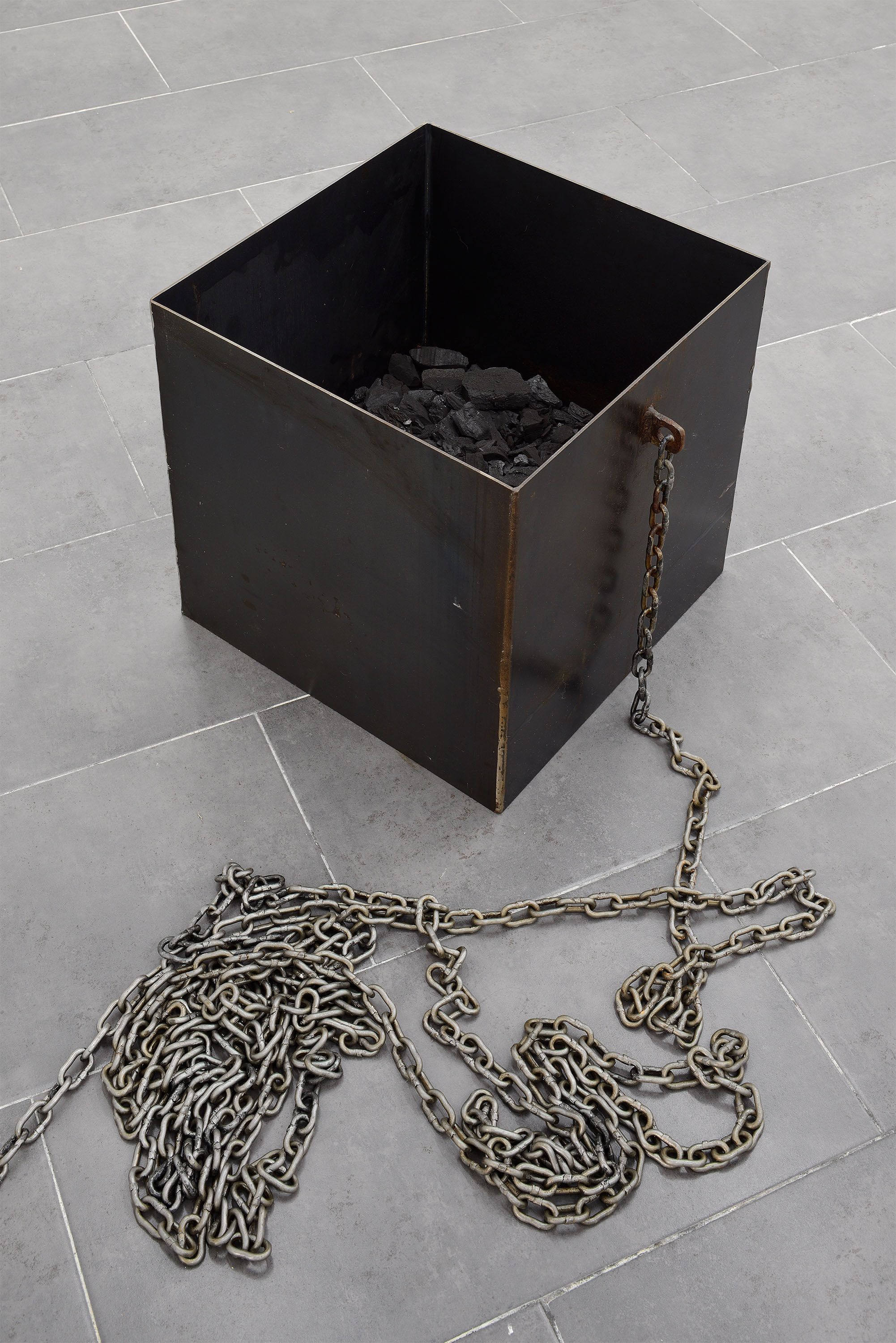 installation view, new words, Emanuel Layr, Rome Grace, 2017 steel, coals 15.5 x 15.5 x 15.5 in 40 x 40 x 40 cm