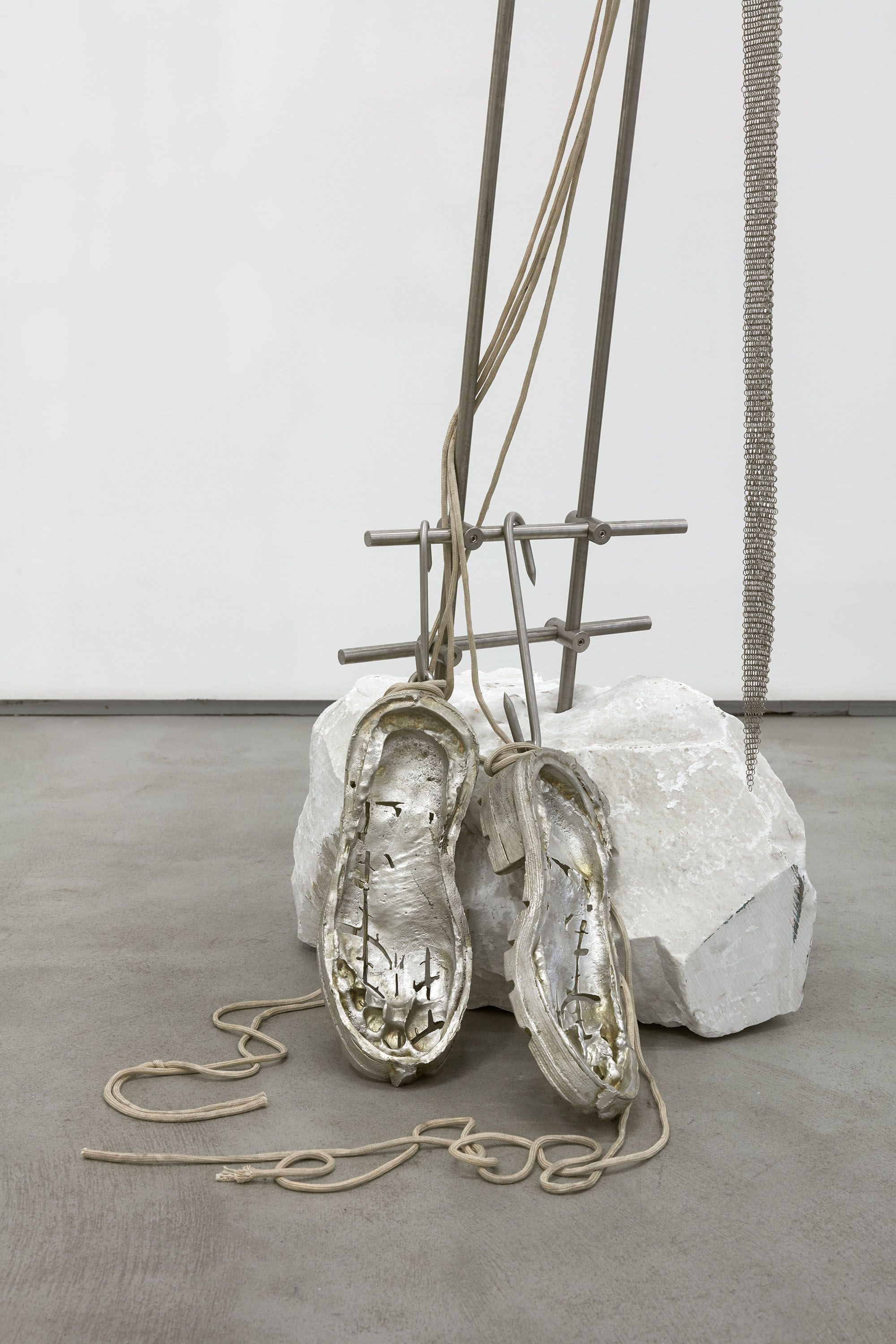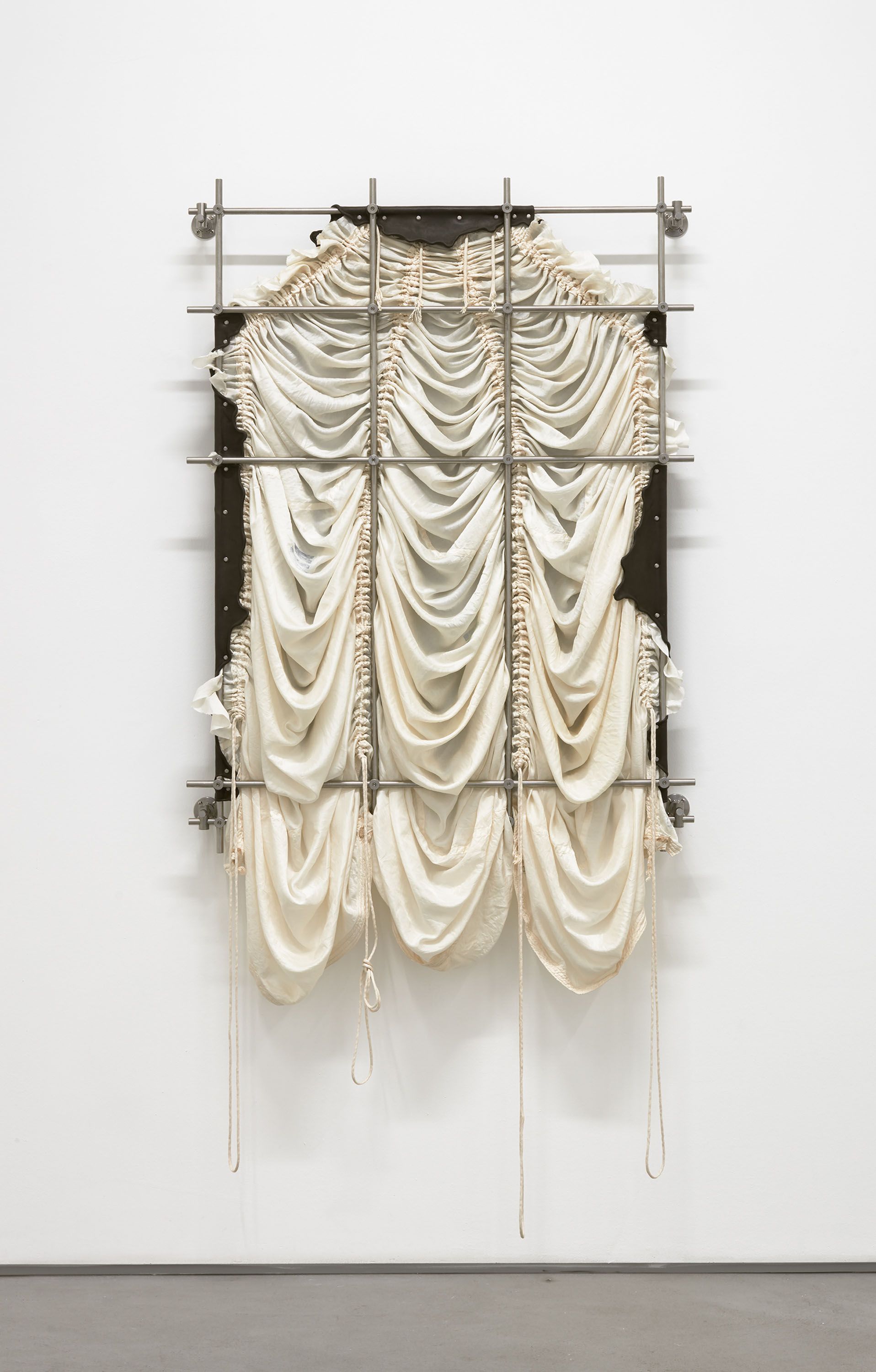 installation view, CONDO London, Sadie Coles HQ, London Dressing for Altitude, 2018 parachute silk, leather, stainless steel dimensions variable Dressing for Altitude, 2018 (detail) parachute silk, leather, stainless steel dimensions variable Historical events influencing the disappearance of this determined that from the end of the time to the beginning of the century, only the area of the current Old was and the early axis remains only as a vestige as it nails itself to the cross., 2018 marble, stainless steel, aluminum, pewter, leather, parachute cord, orthopedic jaw fixation device 78 x 17 x 10 in 198 x 43 x 25.5 cm Historical events influencing the disappearance of this determined that from the end of the time to the beginning of the century, only the area of the current Old was and the early axis remains only as a vestige as it nails itself to the cross., 2018 (detail) marble, stainless steel, aluminum, pewter, leather, parachute cord, orthopedic jaw fixation device 78 x 17 x 10 in 198 x 43 x 25.5 cm Historical events influencing the disappearance of this determined that from the end of the time to the beginning of the century, only the area of the current Old was and the early axis remains only as a vestige as it nails itself to the cross., 2018 (detail) marble, stainless steel, aluminum, pewter, leather, parachute cord, orthopedic jaw fixation device 78 x 17 x 10 in 198 x 43 x 25.5 cm