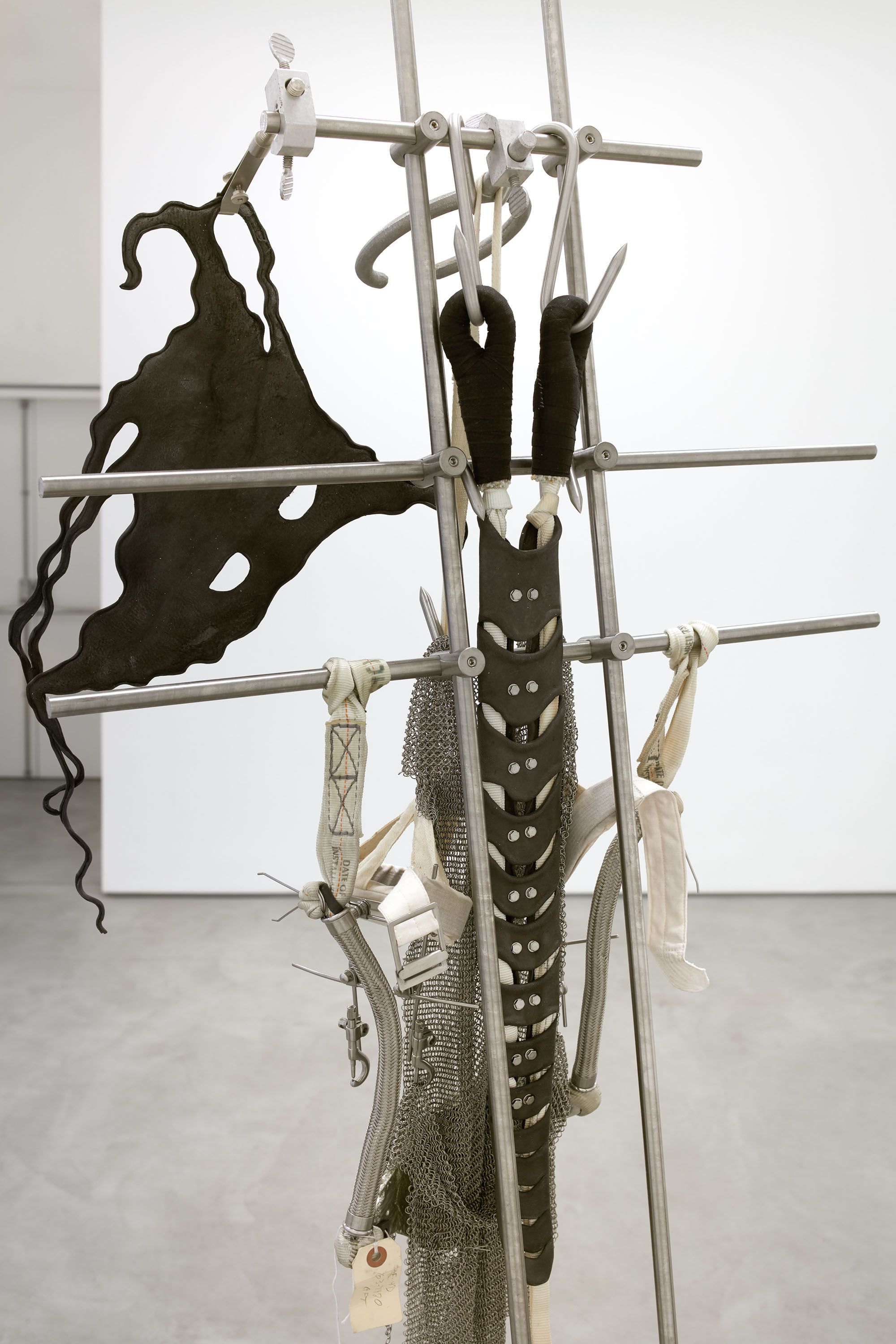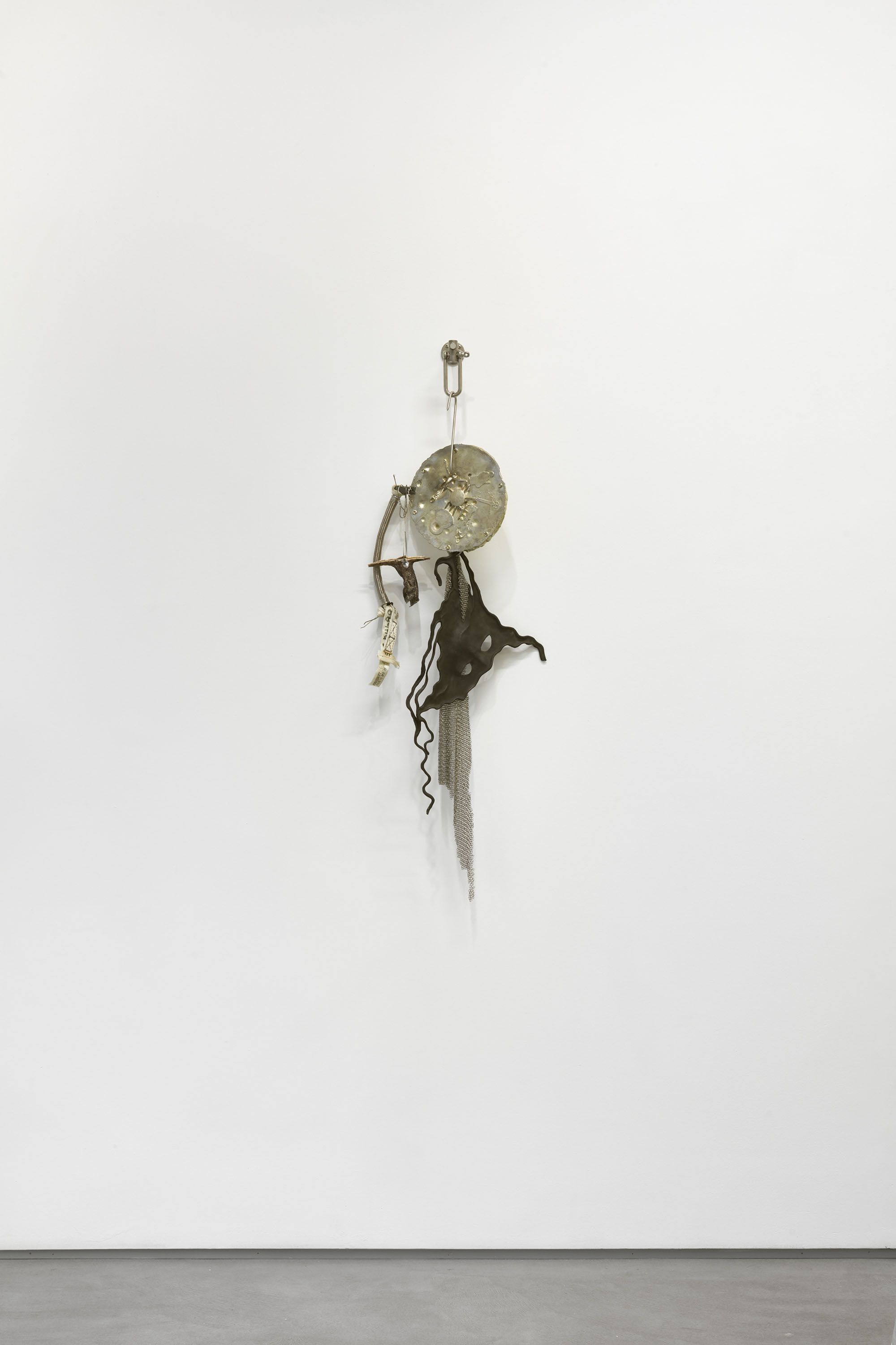 installation view, CONDO London, Sadie Coles HQ, London His Master’s Voice (such a medal, when given in ceremony is placed high around the neck, A Dog’s Collar). Attempts to keep up conversation with it rather like holding up the head of a corpse, 2018 (detail) stainless steel, parachute hardware, aluminum, pewter, leather, oyster shell 48 x 15 x 15 in 122 x 38 x 38 cm His Master’s Voice (such a medal, when given in ceremony is placed high around the neck, A Dog’s Collar). Attempts to keep up conversation with it rather like holding up the head of a corpse, 2018 (detail) stainless steel, parachute hardware, aluminum, pewter, leather, oyster shell 48 x 15 x 15 in 122 x 38 x 38 cm