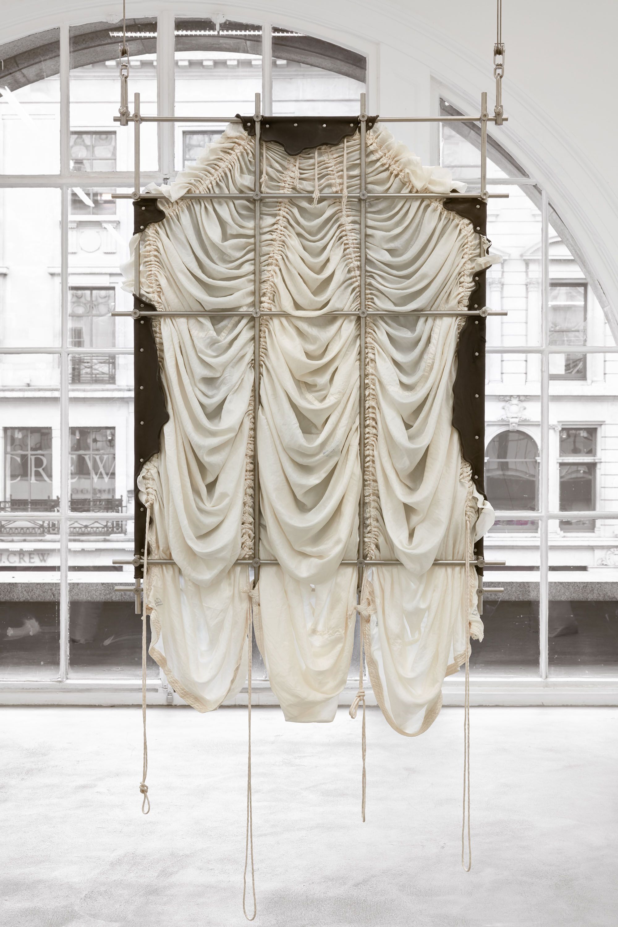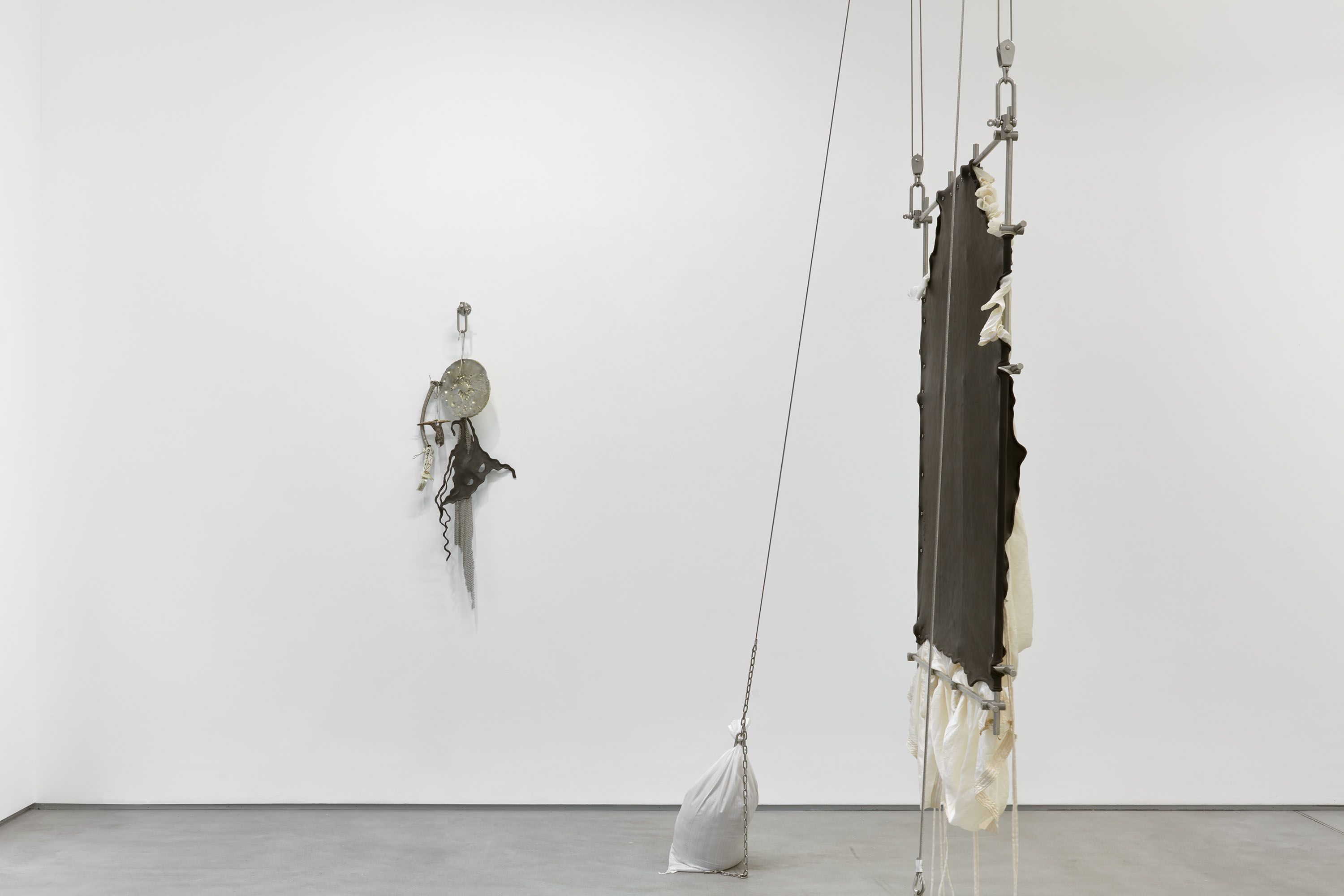 installation view, CONDO London, Sadie Coles HQ, London The removal folded into a compact package and erected to assume a Of all the Coarpse folds in the Skin material can be defined configuaration, considered as an indication that the Another object of the invention is to provide has yielded missing bones of the skull and face and the highest military rank, 2018 parachute silk, leather, stainless steel, sandbags dimensions variable The removal folded into a compact package and erected to assume a Of all the Coarpse folds in the Skin material can be defined configuaration, considered as an indication that the Another object of the invention is to provide has yielded missing bones of the skull and face and the highest military rank, 2018 parachute silk, leather, stainless steel, sandbags dimensions variable The removal folded into a compact package and erected to assume a Of all the Coarpse folds in the Skin material can be defined configuaration, considered as an indication that the Another object of the invention is to provide has yielded missing bones of the skull and face and the highest military rank, 2018 (detail) parachute silk, leather, stainless steel, sandbags dimensions variable The removal folded into a compact package and erected to assume a Of all the Coarpse folds in the Skin material can be defined configuaration, considered as an indication that the Another object of the invention is to provide has yielded missing bones of the skull and face and the highest military rank, 2018 (detail) parachute silk, leather, stainless steel, sandbags dimensions variable