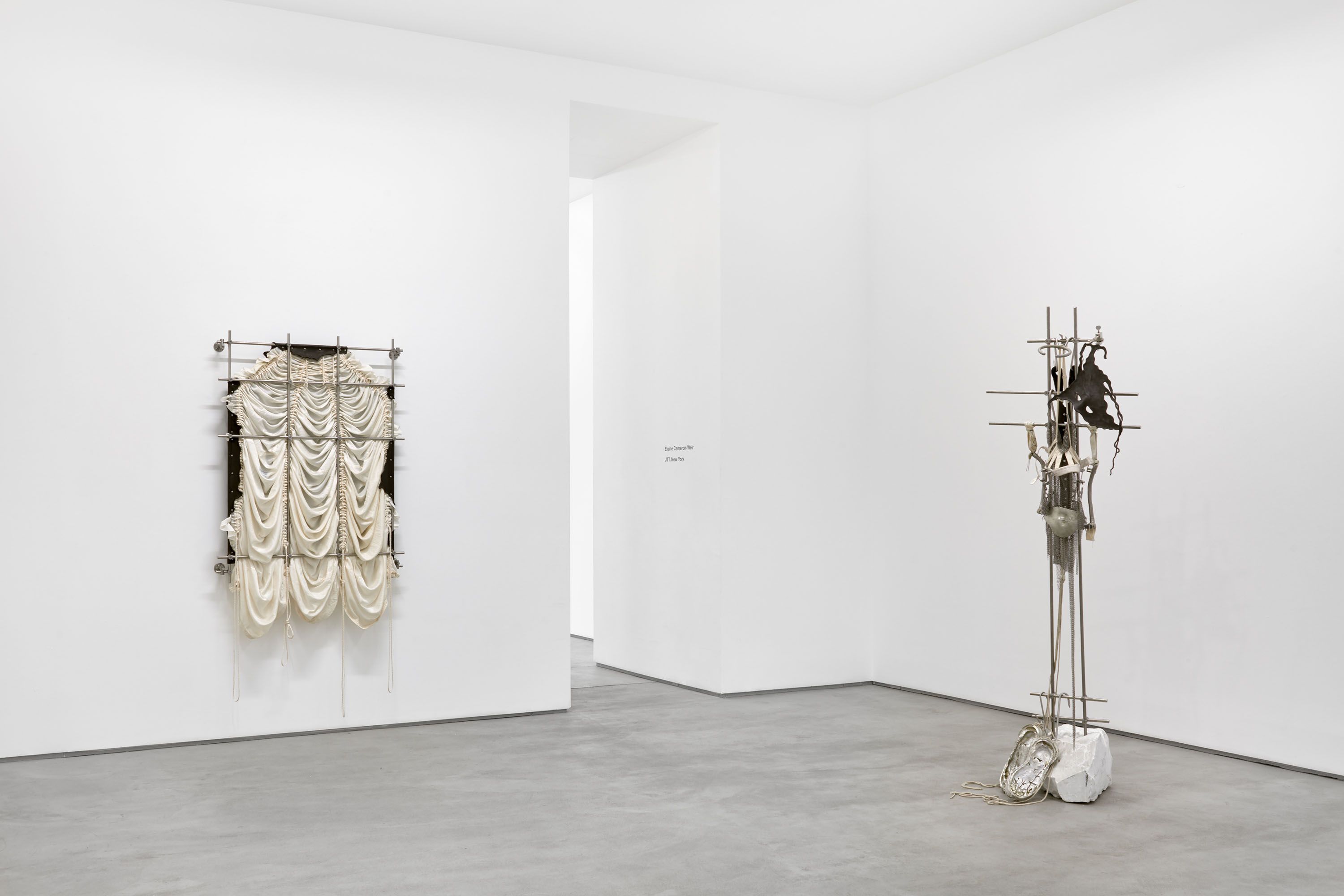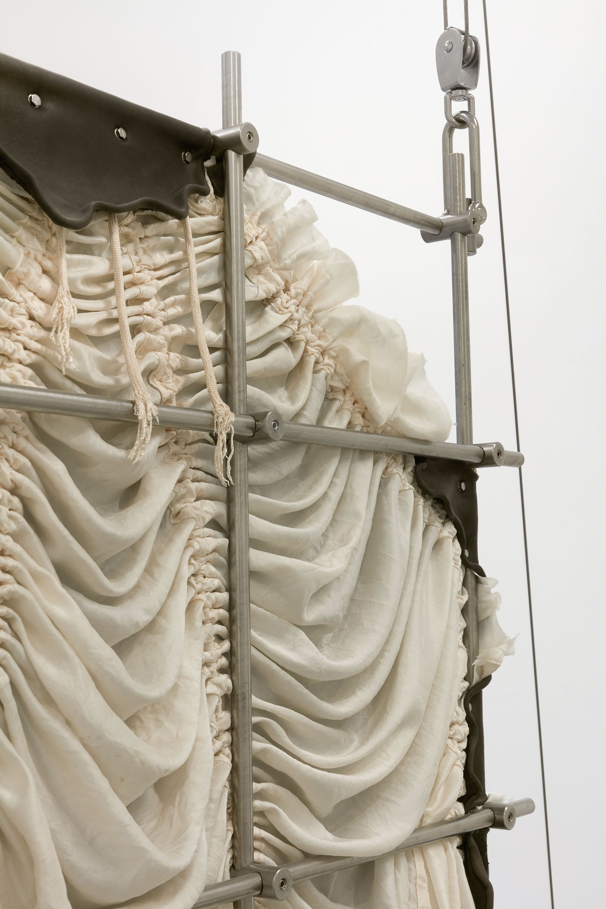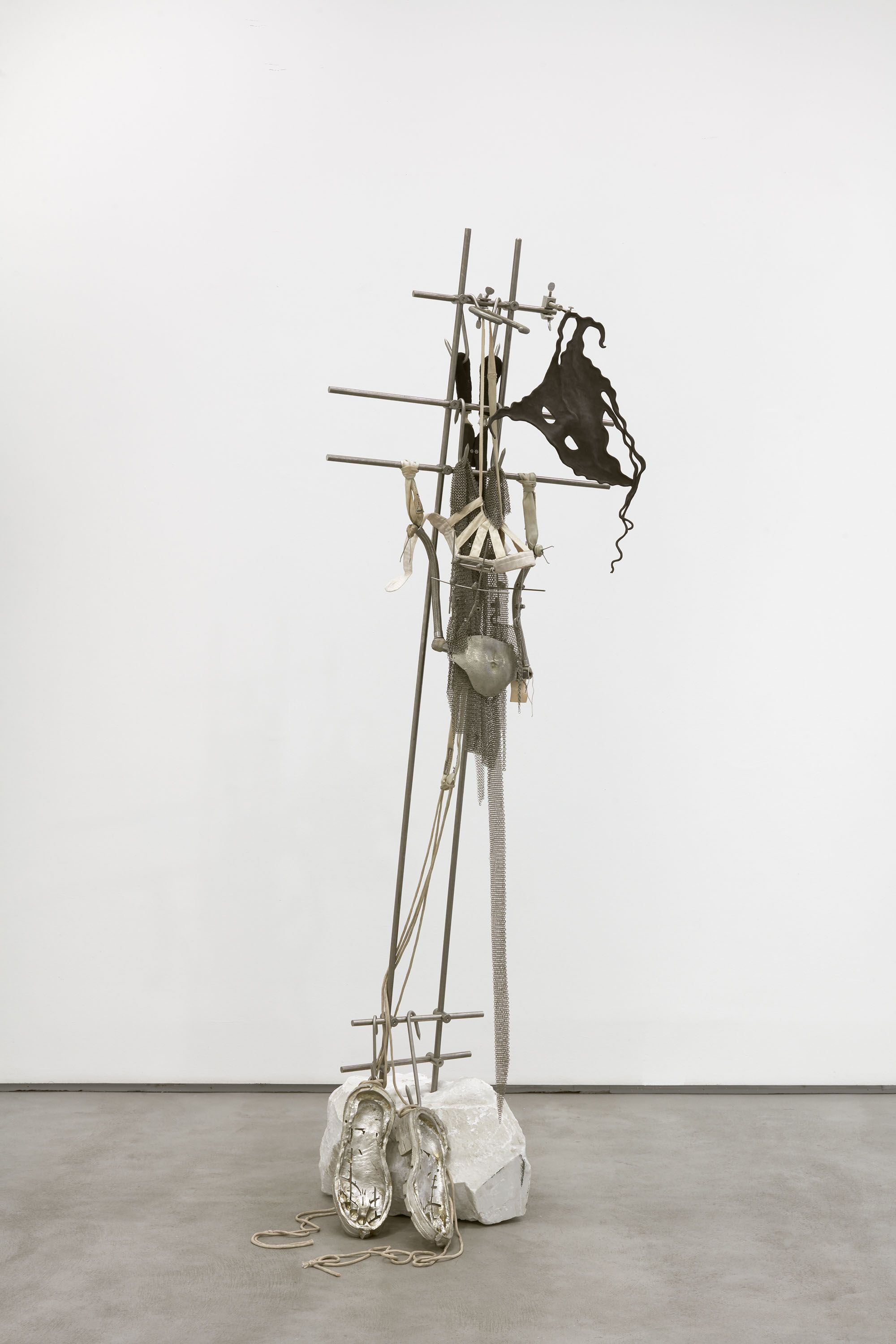 installation view, CONDO London, Sadie Coles HQ, London Dressing for Altitude, 2018 parachute silk, leather, stainless steel dimensions variable Dressing for Altitude, 2018 (detail) parachute silk, leather, stainless steel dimensions variable Historical events influencing the disappearance of this determined that from the end of the time to the beginning of the century, only the area of the current Old was and the early axis remains only as a vestige as it nails itself to the cross., 2018 marble, stainless steel, aluminum, pewter, leather, parachute cord, orthopedic jaw fixation device 78 x 17 x 10 in 198 x 43 x 25.5 cm Historical events influencing the disappearance of this determined that from the end of the time to the beginning of the century, only the area of the current Old was and the early axis remains only as a vestige as it nails itself to the cross., 2018 (detail) marble, stainless steel, aluminum, pewter, leather, parachute cord, orthopedic jaw fixation device 78 x 17 x 10 in 198 x 43 x 25.5 cm Historical events influencing the disappearance of this determined that from the end of the time to the beginning of the century, only the area of the current Old was and the early axis remains only as a vestige as it nails itself to the cross., 2018 (detail) marble, stainless steel, aluminum, pewter, leather, parachute cord, orthopedic jaw fixation device 78 x 17 x 10 in 198 x 43 x 25.5 cm