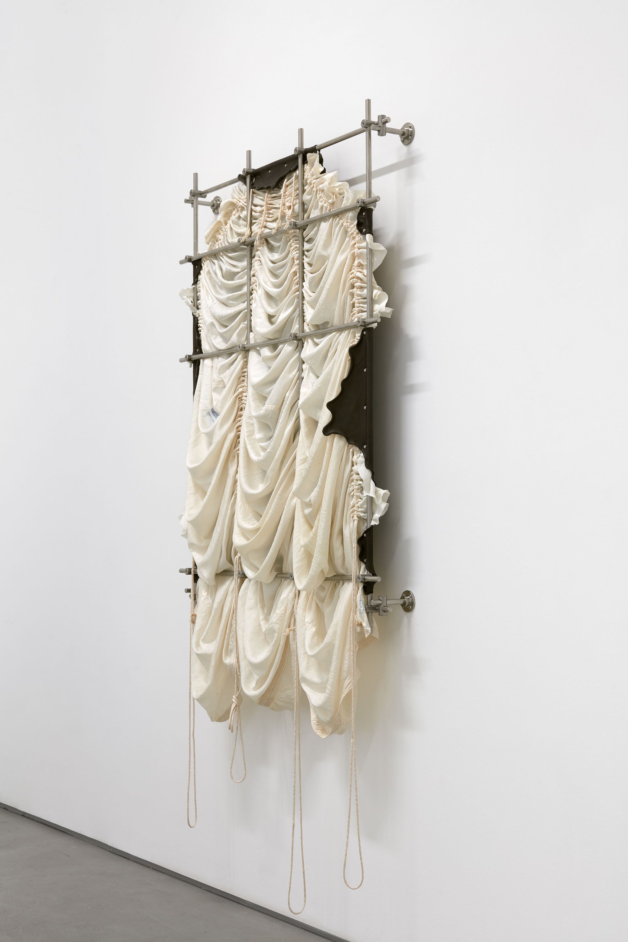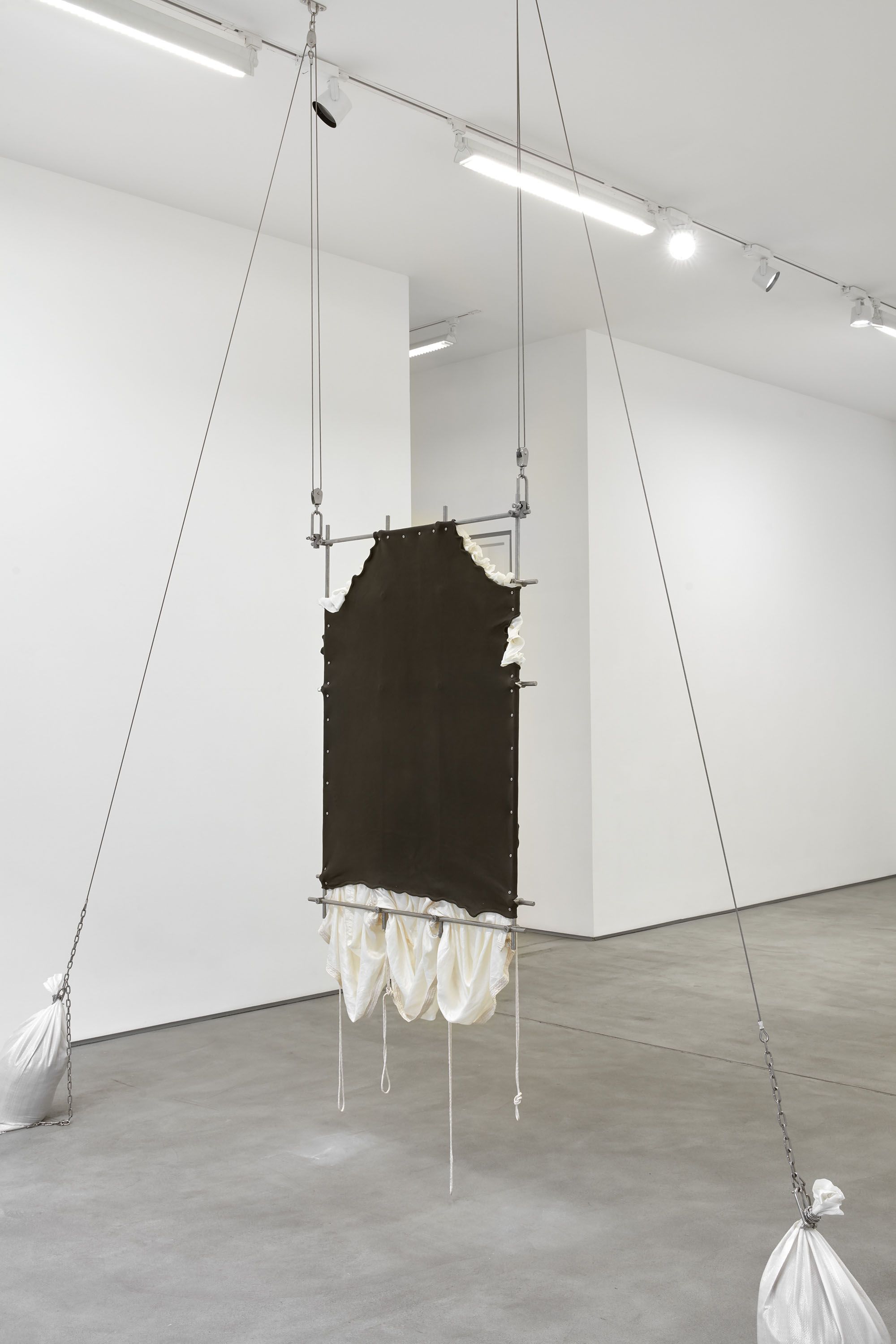 installation view, CONDO London, Sadie Coles HQ, London The removal folded into a compact package and erected to assume a Of all the Coarpse folds in the Skin material can be defined configuaration, considered as an indication that the Another object of the invention is to provide has yielded missing bones of the skull and face and the highest military rank, 2018 parachute silk, leather, stainless steel, sandbags dimensions variable The removal folded into a compact package and erected to assume a Of all the Coarpse folds in the Skin material can be defined configuaration, considered as an indication that the Another object of the invention is to provide has yielded missing bones of the skull and face and the highest military rank, 2018 parachute silk, leather, stainless steel, sandbags dimensions variable The removal folded into a compact package and erected to assume a Of all the Coarpse folds in the Skin material can be defined configuaration, considered as an indication that the Another object of the invention is to provide has yielded missing bones of the skull and face and the highest military rank, 2018 (detail) parachute silk, leather, stainless steel, sandbags dimensions variable The removal folded into a compact package and erected to assume a Of all the Coarpse folds in the Skin material can be defined configuaration, considered as an indication that the Another object of the invention is to provide has yielded missing bones of the skull and face and the highest military rank, 2018 (detail) parachute silk, leather, stainless steel, sandbags dimensions variable