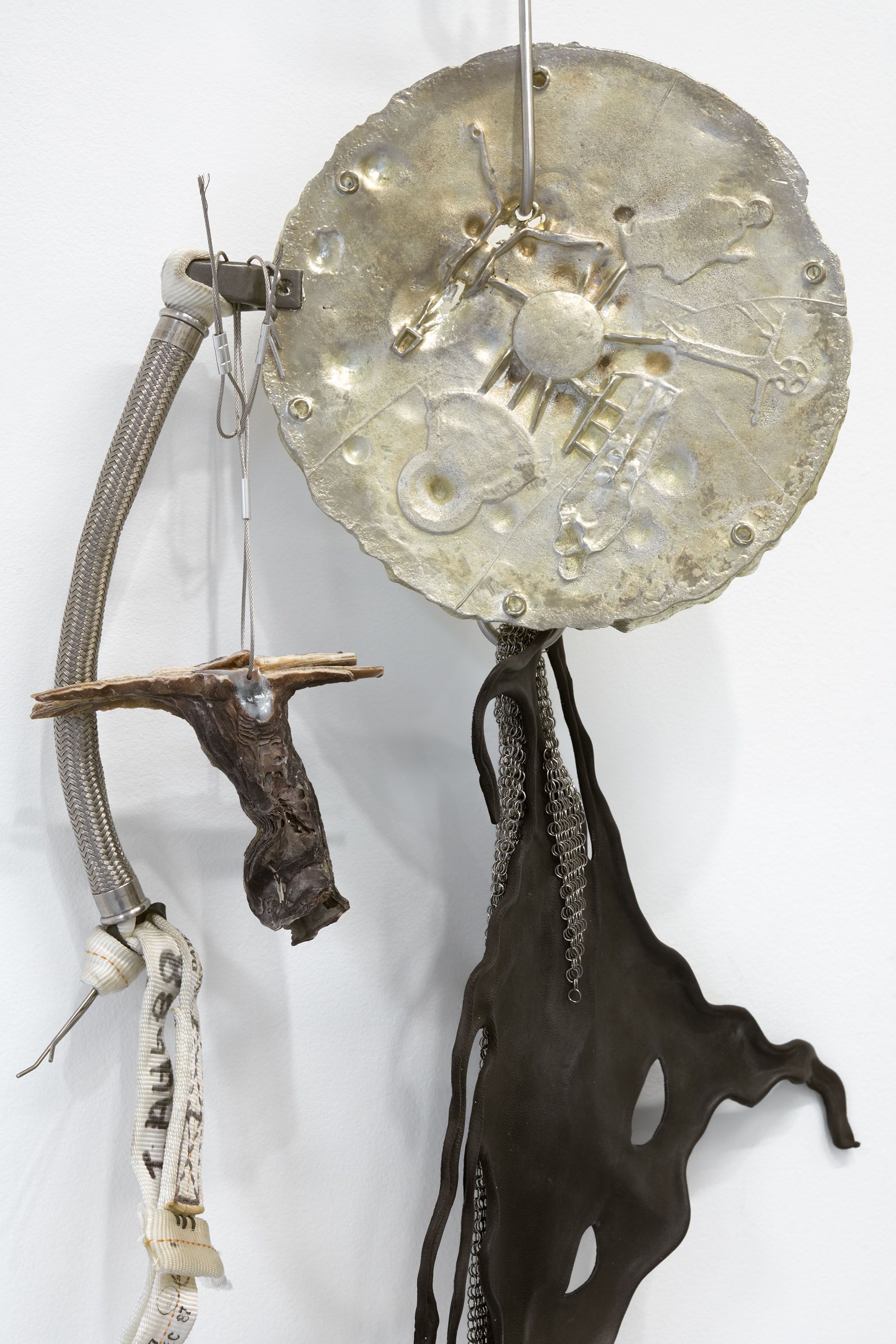 installation view, CONDO London, Sadie Coles HQ, London His Master’s Voice (such a medal, when given in ceremony is placed high around the neck, A Dog’s Collar). Attempts to keep up conversation with it rather like holding up the head of a corpse, 2018 (detail) stainless steel, parachute hardware, aluminum, pewter, leather, oyster shell 48 x 15 x 15 in 122 x 38 x 38 cm His Master’s Voice (such a medal, when given in ceremony is placed high around the neck, A Dog’s Collar). Attempts to keep up conversation with it rather like holding up the head of a corpse, 2018 (detail) stainless steel, parachute hardware, aluminum, pewter, leather, oyster shell 48 x 15 x 15 in 122 x 38 x 38 cm